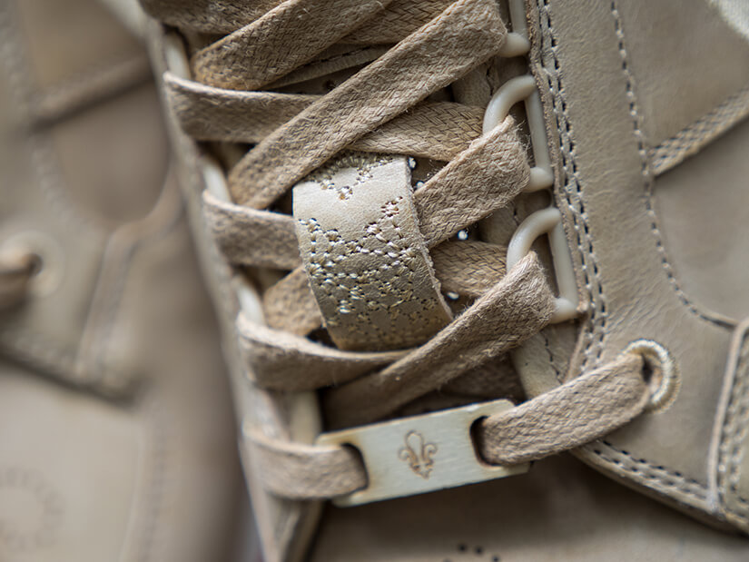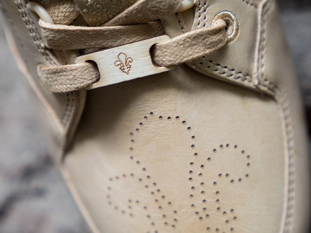 La piel de curtido vegetal utilizada en el upper ha sido suministrada por el prestigioso curtidor francés Tanneries Roux, empresa nacida a principios del siglo XIX en Romans sur Isère, popular ciudad del sur de Francia conocida por la fabricación de zapatos de lujo.