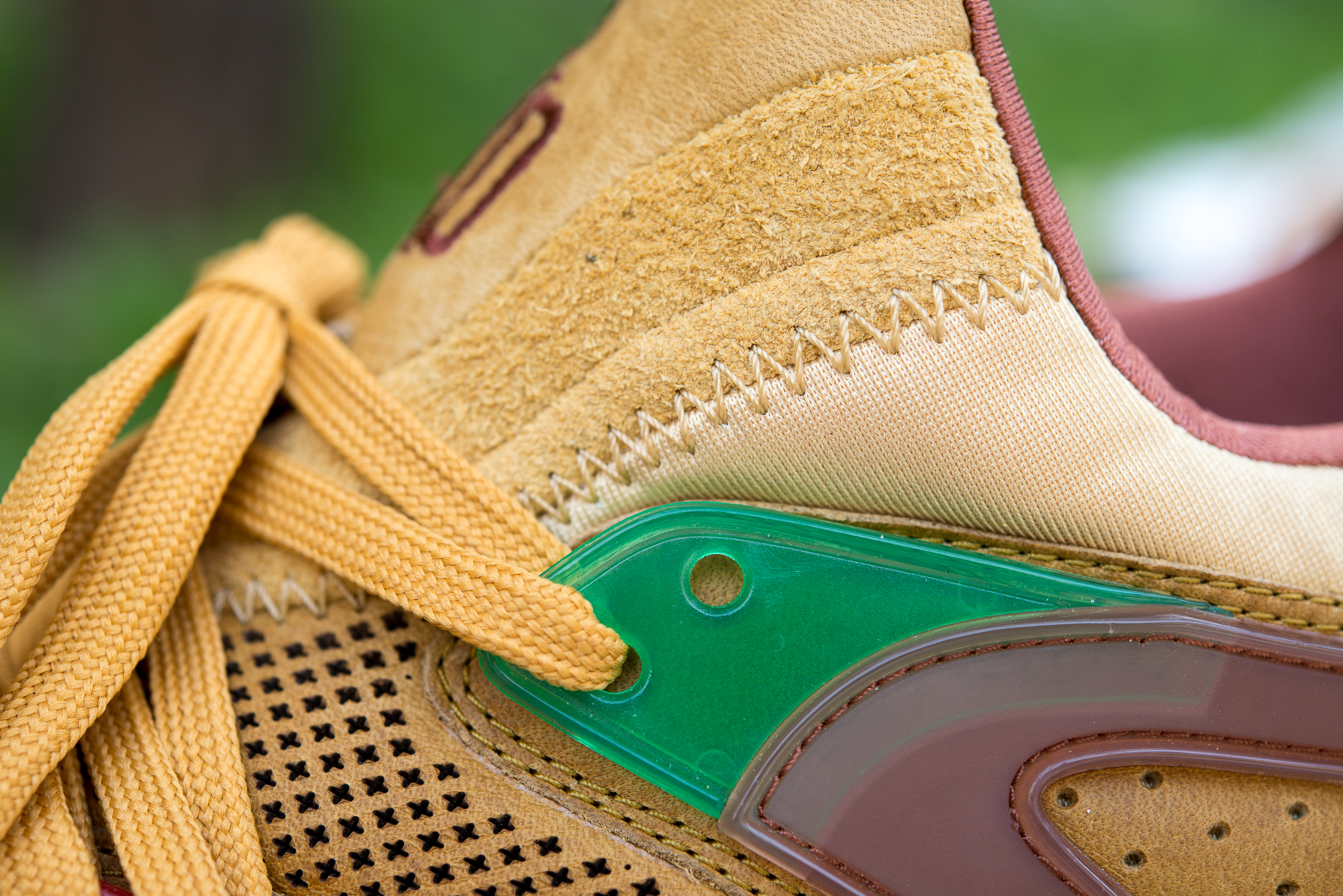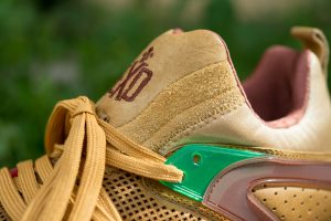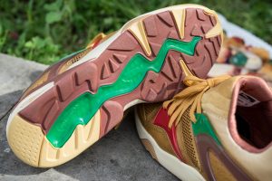 Estas especiales Blaze of Glory «Castañas» se caracterizan por una cuidada selección de materiales, donde una muy interesante piel encerada ocupa el protagonismo, en combinación con nylons y otros detalles en TPU. Como suele ser habitual en este modelo, una mediasuela moldeada con tecnología Trinomic termina el diseño, que se ha chispeado con motas a tono del conjunto.